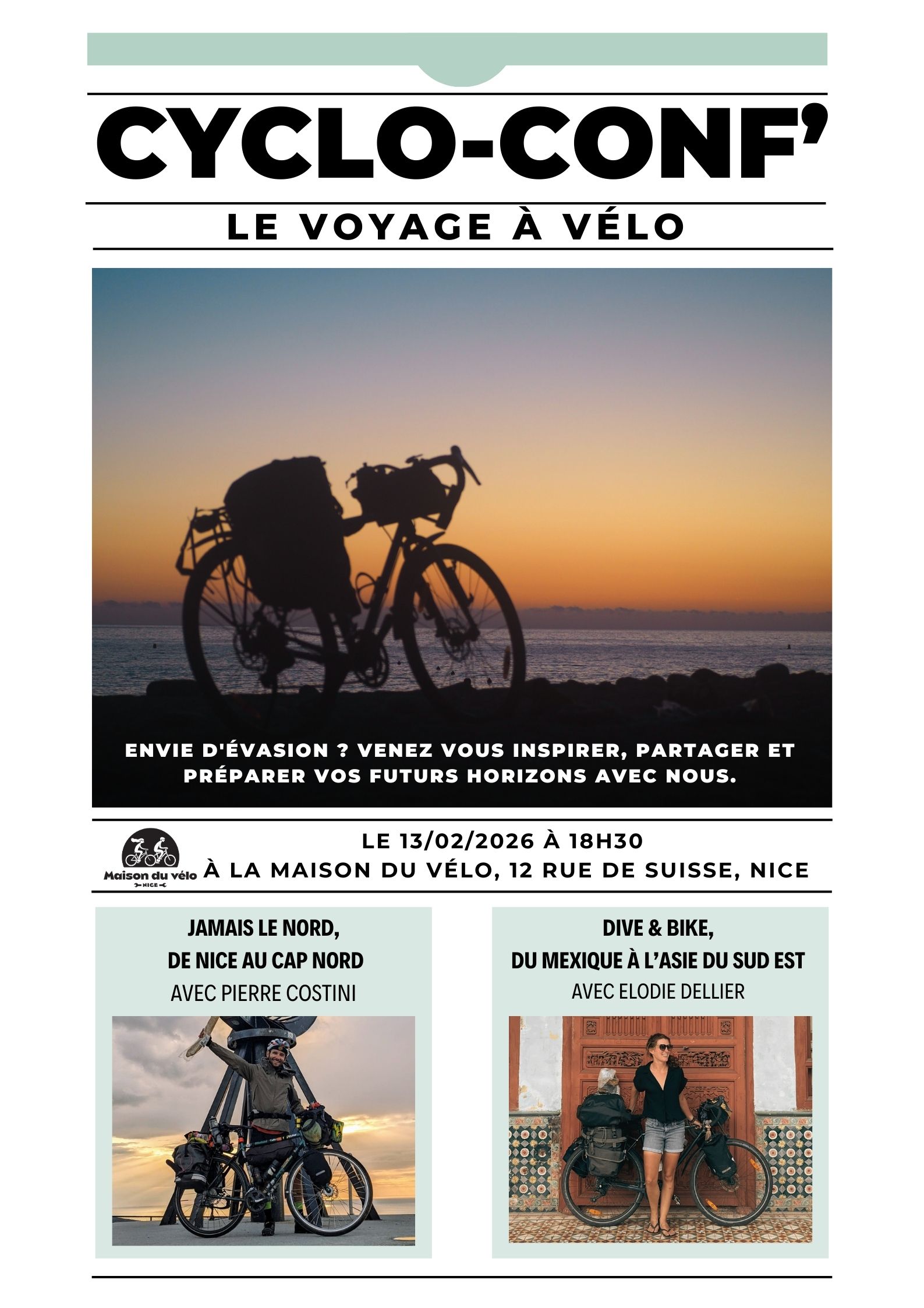 Programme: 1. Parcours vélo enfant - Parvis du Ray, Nice 2. Cours de vélo pour adultes débutants - Cagnes sur mer 3. Balade pédagogique - Cagnes sur mer 4. Atelier d'auto-réparation à la Maison de l'Environnement, Nice 6. Cyclo-conf sur le voyage à vélo à la Maison du Vélo |